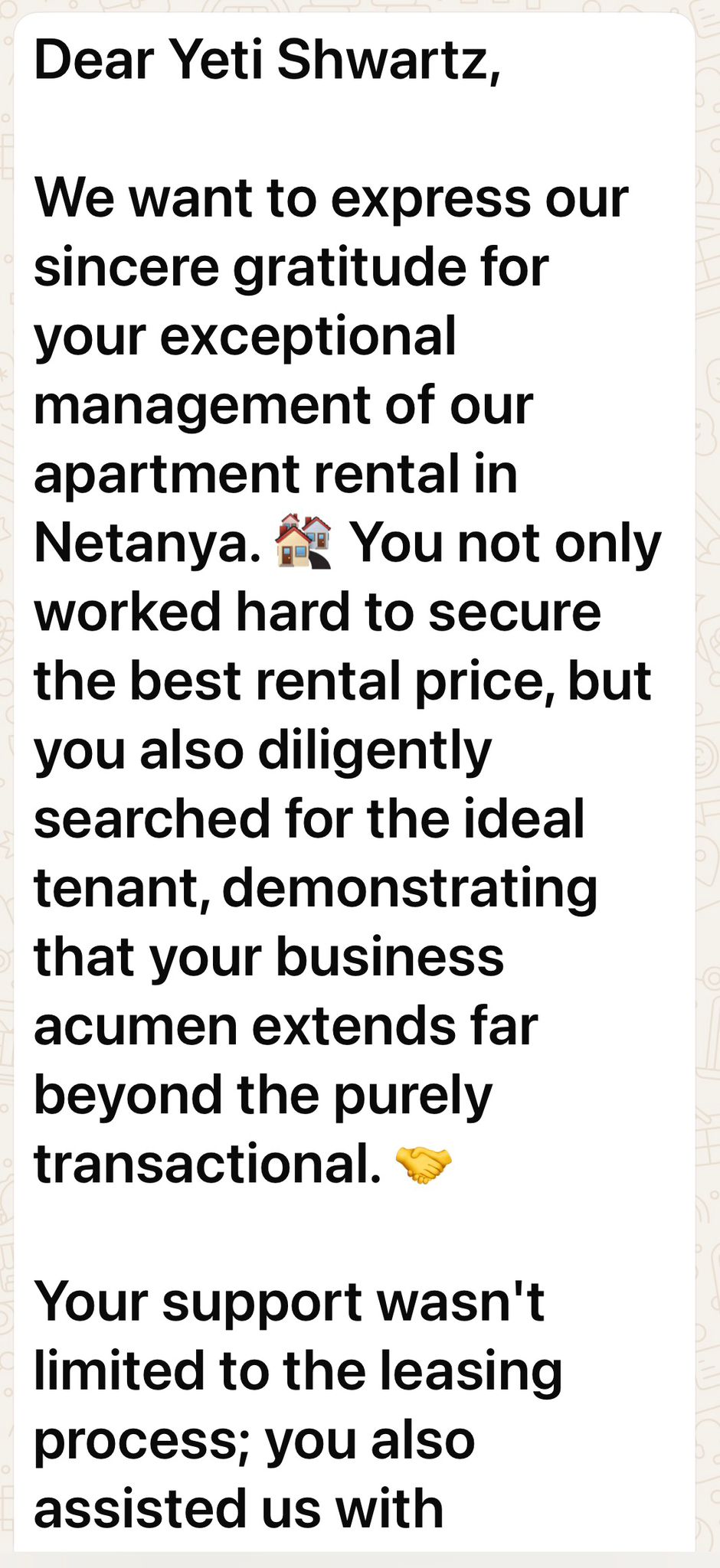 We want to express our sincere gratitude for your exceptional management of our apartment rental in Netanya. You not only worked hard to secure the best rental price, but you also diligently searched for the ideal tenant, demonstrating that your business acumen extends far beyond the purely transactional.